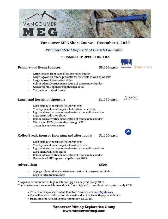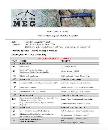Date: December 4, 2025 Location: UBC Robson Square Gold and Silver has been the backbone of the BC mining and exploration sector. We will have talks on geology as well as deposits and the markets.